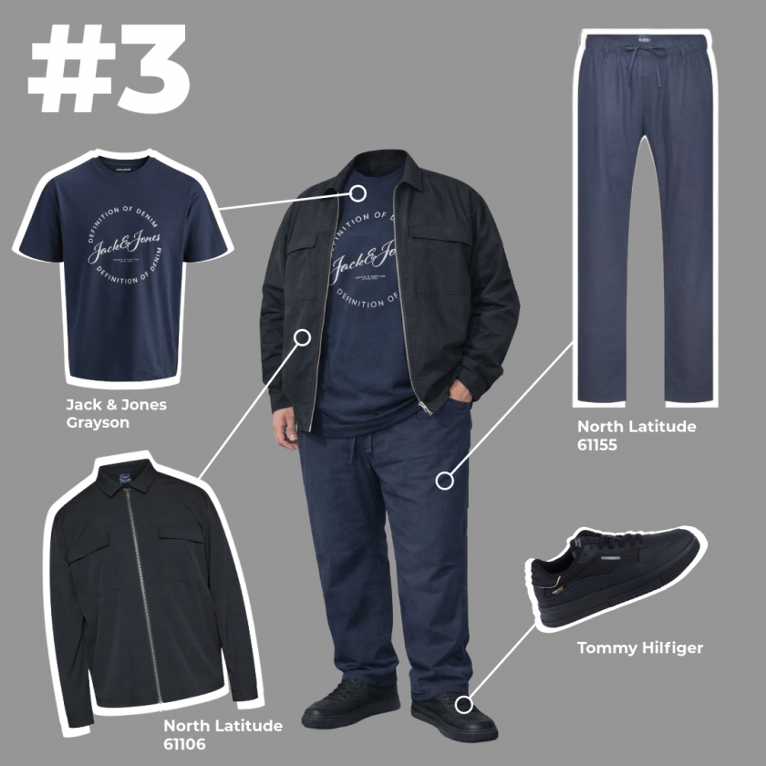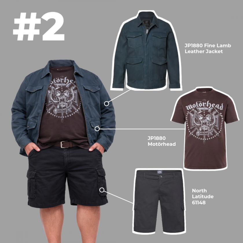 Hyvä valinta viileämpiin kevätpäiviin. Takki tuo lämpöä, T-paita pitää olon mukavana, ja cargoshortsit lisäävät käytännöllisyyttä taskuillaan.