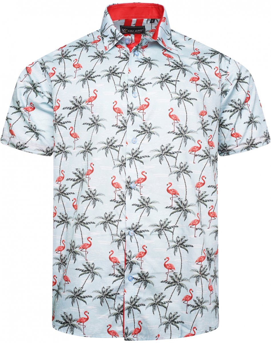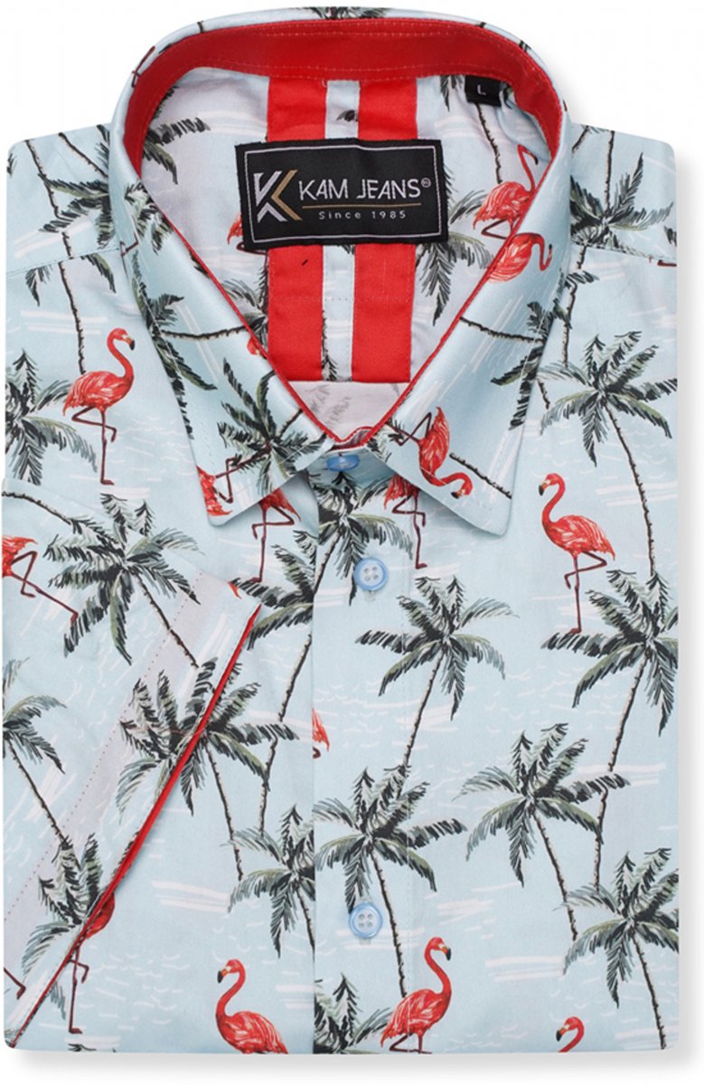 Koko-opas - Kam Jeans 6067 Flamingo and Palm Tree Short Sleeve Shirt Blue