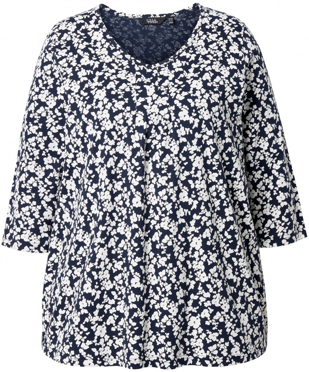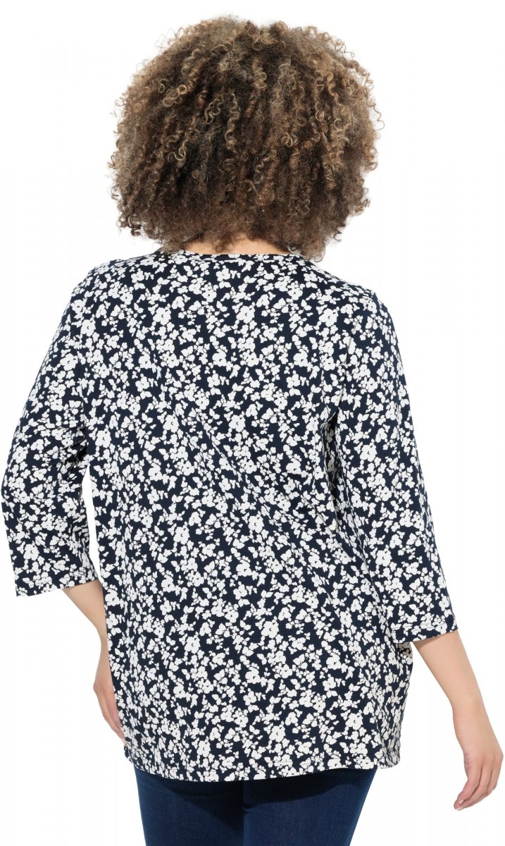 Ulla Popken Floral 3/4 Sleeve V-Neck A-Line Tee Navy